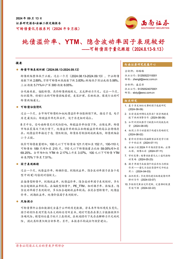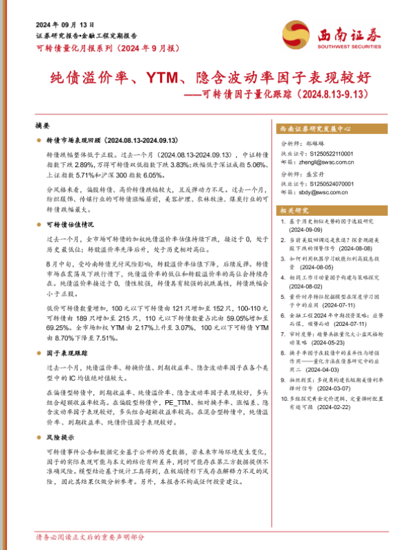 【西南证券】【20240913】可转债因子量化跟踪:纯债溢价率、YTM、隐含波动率因子表现较好-13页