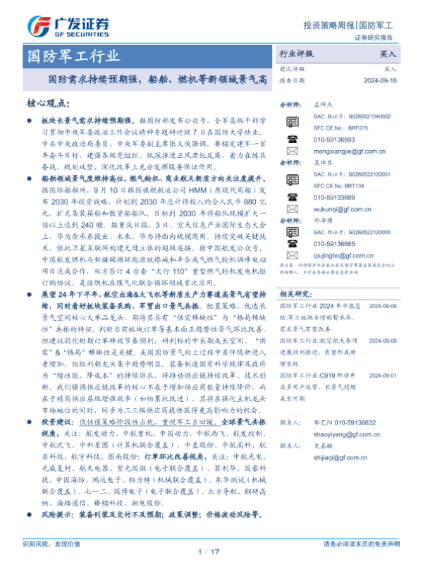 【广发证券】【20240916】国防军工行业:国防需求持续预期强,船舶、燃机等新领域景气高-17页