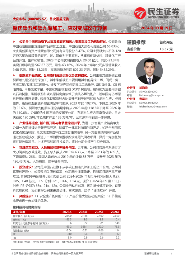 【民生证券】【20240919】大庆华科(000985)首次覆盖报告:聚焦碳五和碳九深加工,应对变局攻守兼备-26页