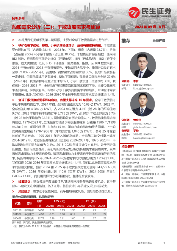 【民生证券】【20240918】机械行业船舶需求分析(二):干散货船需求与测算-26页