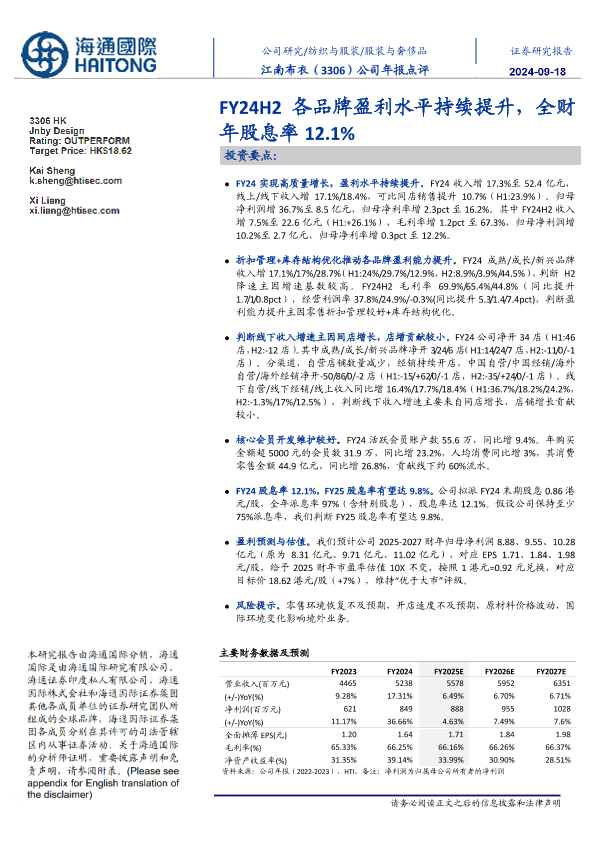 【海通国际】【20240918】江南布衣(03306.HK)FY24H2各品牌盈利水平持续提升,全财年股息率12.1%-11页