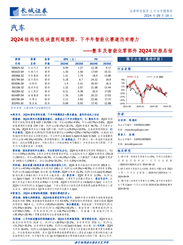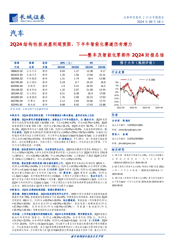 【长城证券】【20240918】汽车行业整车及智能化零部件2Q24财报总结:2Q24结构性板块盈利超预期,下半年智能化赛道仍有潜力-17页