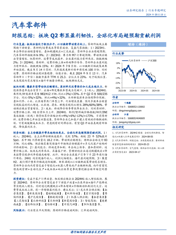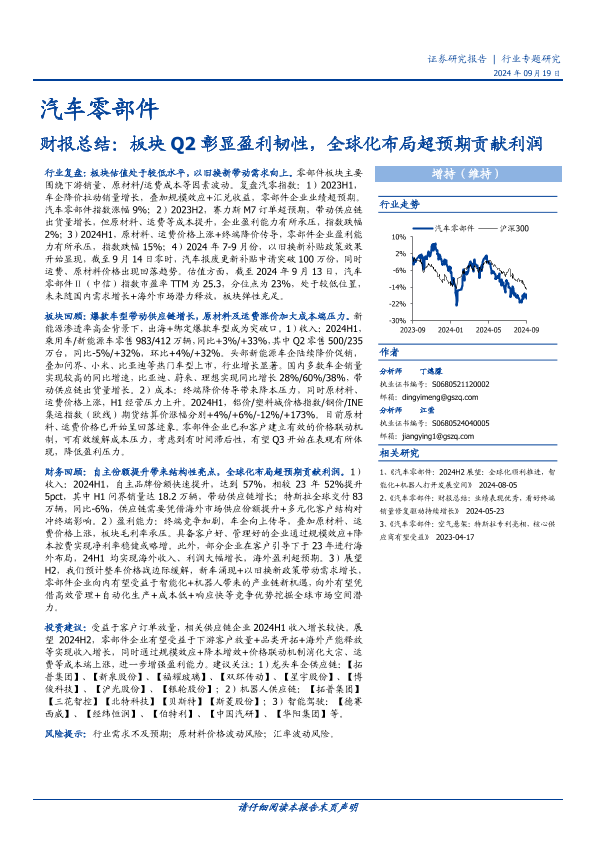 【国盛证券】【20240919】汽车零部件行业财报总结:板块Q2彰显盈利韧性,全球化布局超预期贡献利润-34页