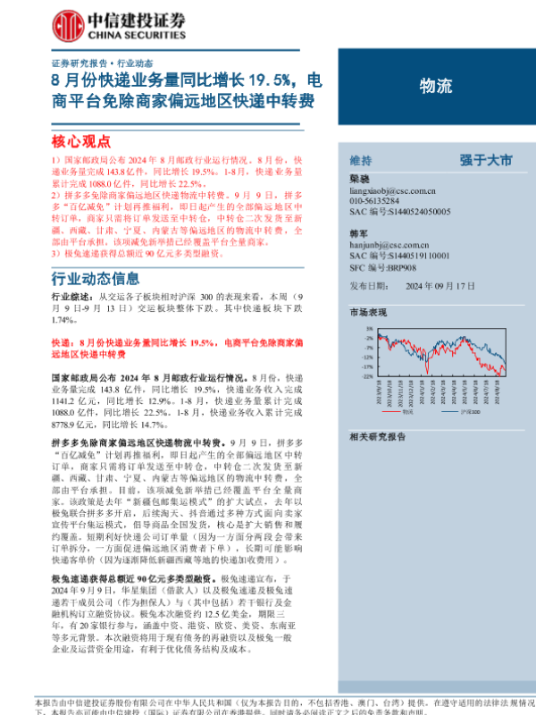 【中信建投证券】【20240917】物流行业:8月份快递业务量同比增长19.5%,电商平台免除商家偏远地区快递中转费-17页