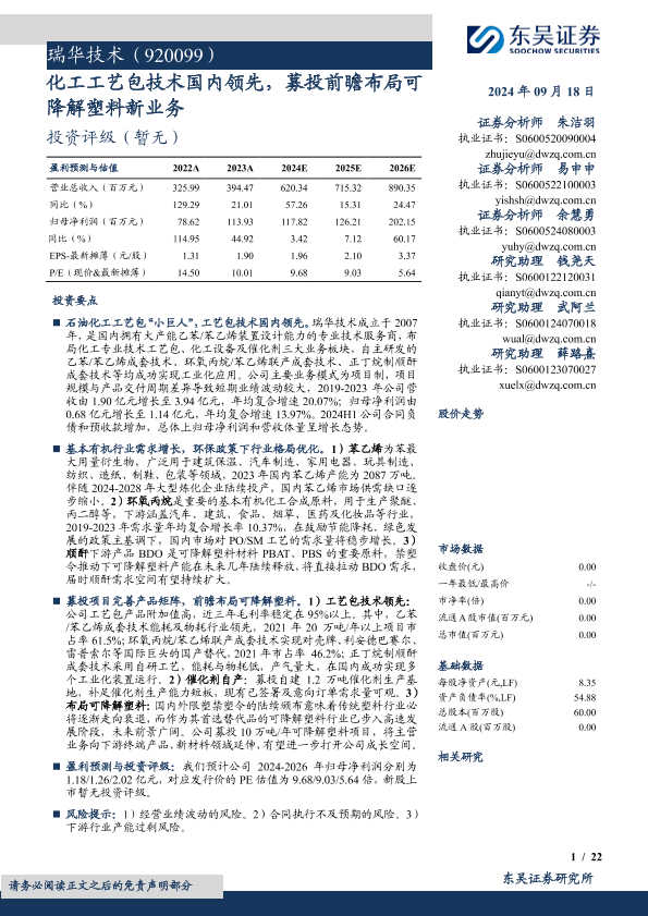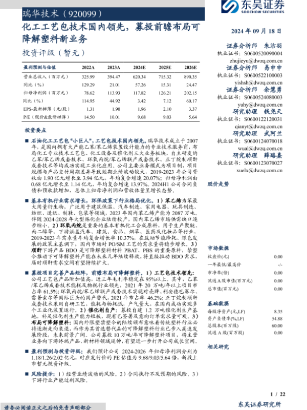 【东吴证券】【20240918】瑞华技术(920099)化工工艺包技术国内领先,募投前瞻布局可降解塑料新业务-22页