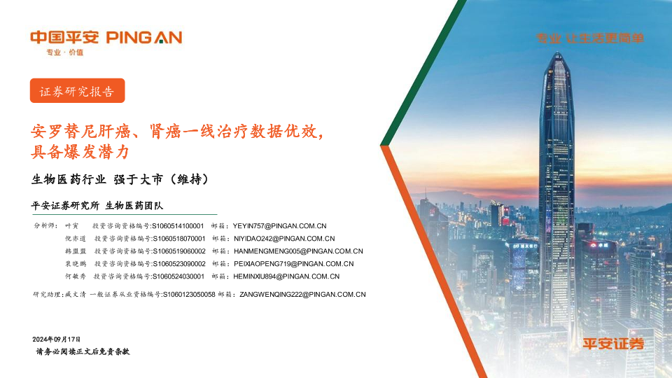 【平安证券】【20240917】生物医药行业:安罗替尼肝癌、肾癌一线治疗数据优效,具备爆发潜力-14页