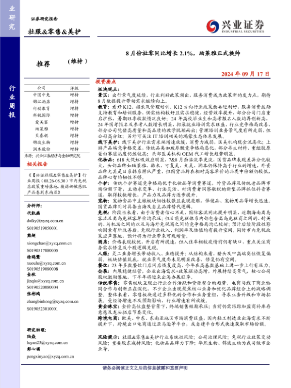 【兴业证券】【20240917】8月份社零同比增长2.1%,珀莱雅正式换帅-13页
