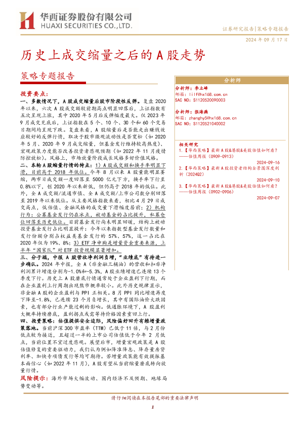 【华西证券】【20240917】历史上成交缩量之后的A股走势-12页