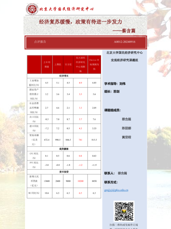 【北京大学国民经济研究中心】【20240916】经济复苏缓慢,政策有待进一步发力-23页