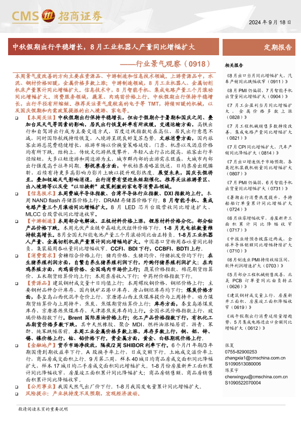 【海通证券】【20240918】行业景气观察:中秋假期出行平稳增长,8月工业机器人产量同比增幅扩大-36页
