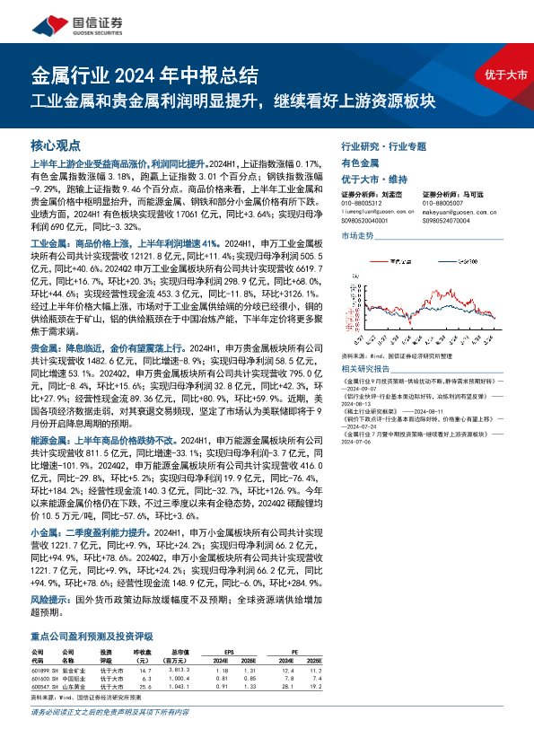 【国信证券】【20240917】金属行业2024年中报总结:工业金属和贵金属利润明显提升,继续看好上游资源板块-31页