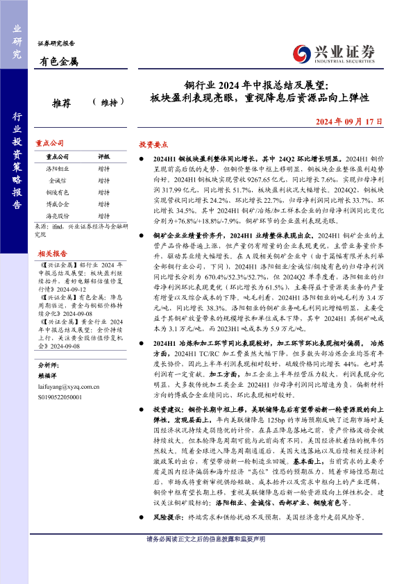 【兴业证券】【20240917】铜行业2024年中报总结及展望:板块盈利表现亮眼,重视降息后资源品向上弹性-11页