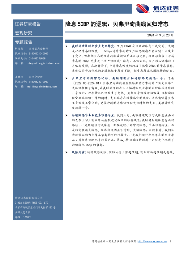【信达证券】【20240920】降息50BP的逻辑:贝弗里奇曲线回归常态-10页