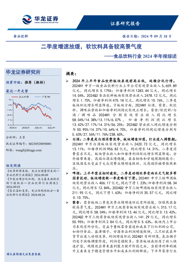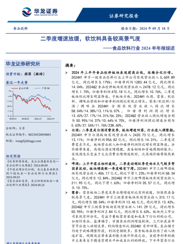【华龙证券】【20240918】食品饮料行业2024半年报综述:二季度增速放缓,软饮料具备较高景气度-20页