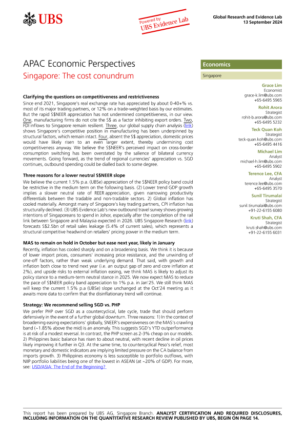 【UBS AG&Singapore Branch】【20240913】APAC Economic Perspectives Singapore The cost conundrum-17页