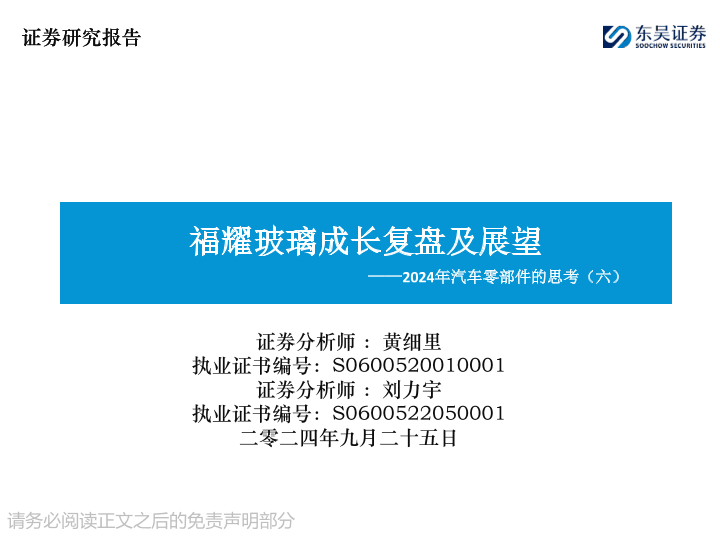 【东吴证券】【20240925】2024年汽车零部件的思考(六):福耀玻璃成长复盘及展望-40页