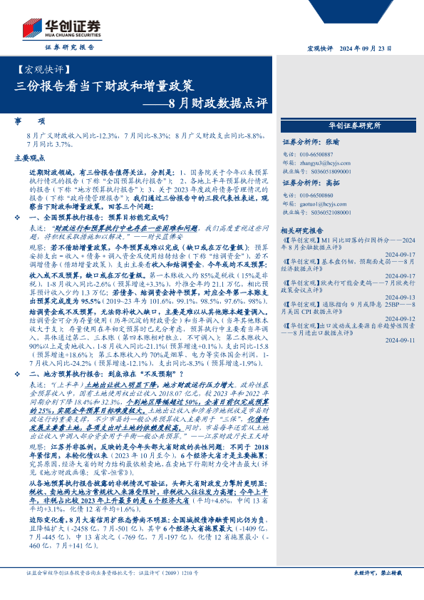 【华创证券】【20240923】【宏观快评】8月财政数据点评:三份报告看当下财政和增量政策-18页