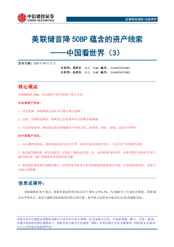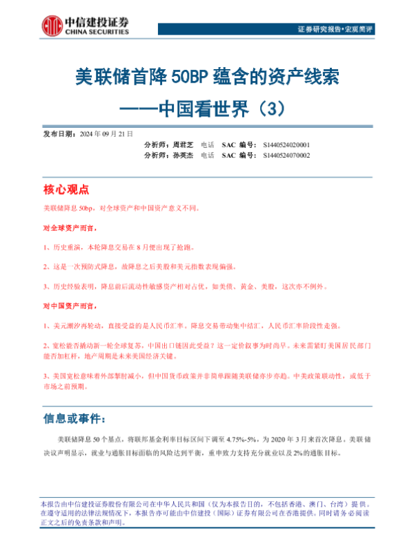 【中信建投证券】【20240921】中国看世界(3):美联储首降50BP蕴含的资产线索-12页