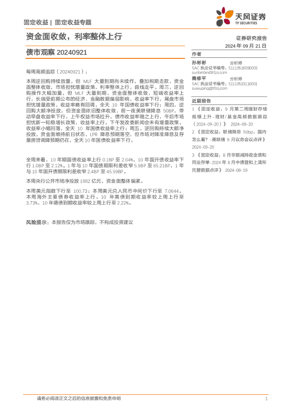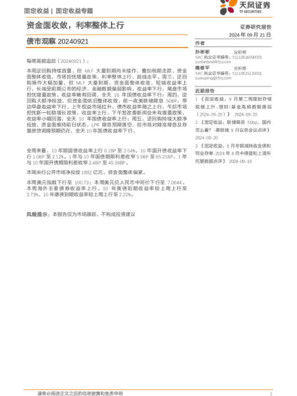 【天风证券】【20240921】债市观察:资金面收敛,利率整体上行-11页