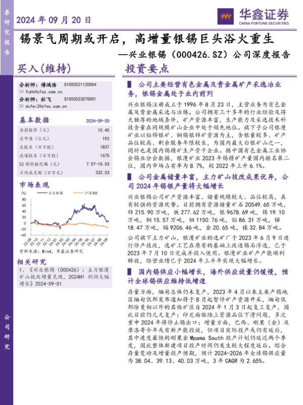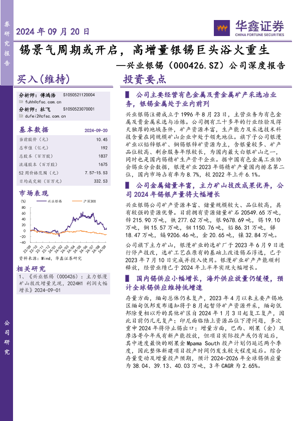 【华鑫证券】【20240920】兴业银锡(000426)公司深度报告:锡景气周期或开启,高增量银锡巨头浴火重生-48页