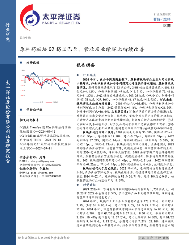 【太平洋证券】【20240918】医药行业:原料药板块Q2拐点已至,营收及业绩环比持续改善-24页