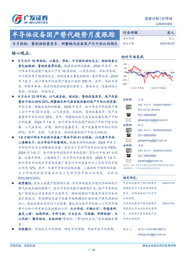 【广发证券】【20240923】半导体设备行业国产替代趋势月度跟踪:6月检测、量测招标量居多,研磨抛光设备国产化中标比例领先-24页
