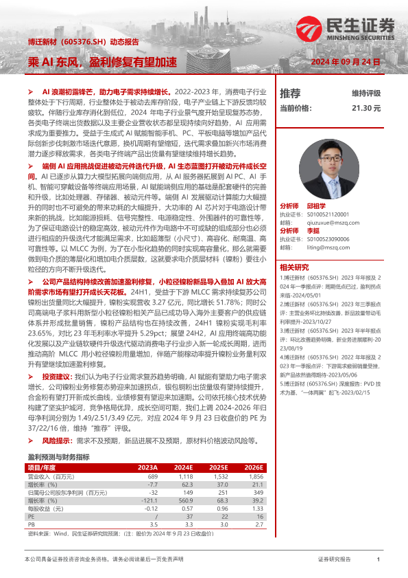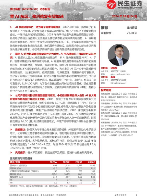 【民生证券】【20240924】博迁新材(605376)动态报告:乘AI东风,盈利修复有望加速-20页