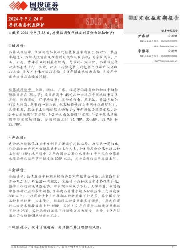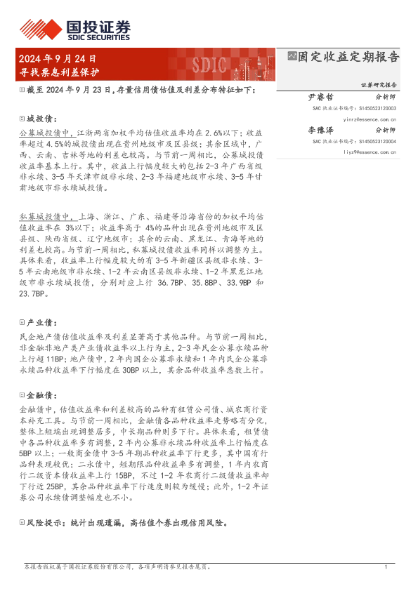 【国投证券】【20240924】固定收益定期报告:寻找票息利差保护-19页