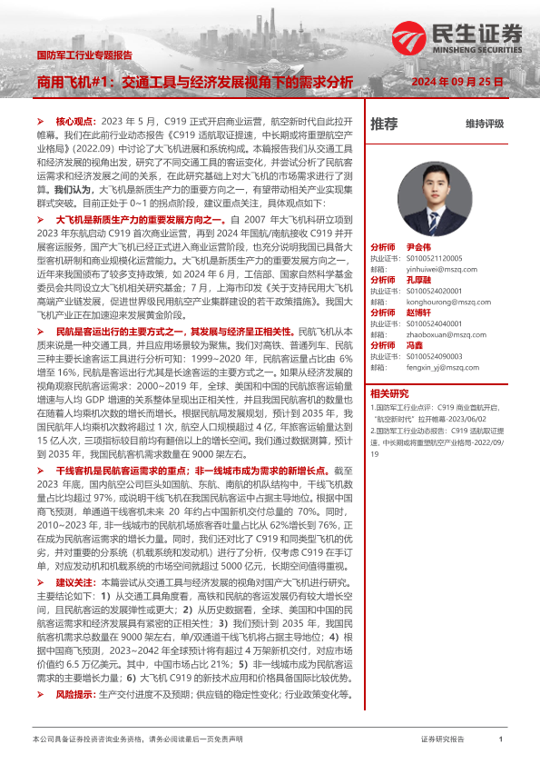 【民生证券】【20240925】国防军工行业专题报告-商用飞机1:交通工具与经济发展视角下的需求分析-26页