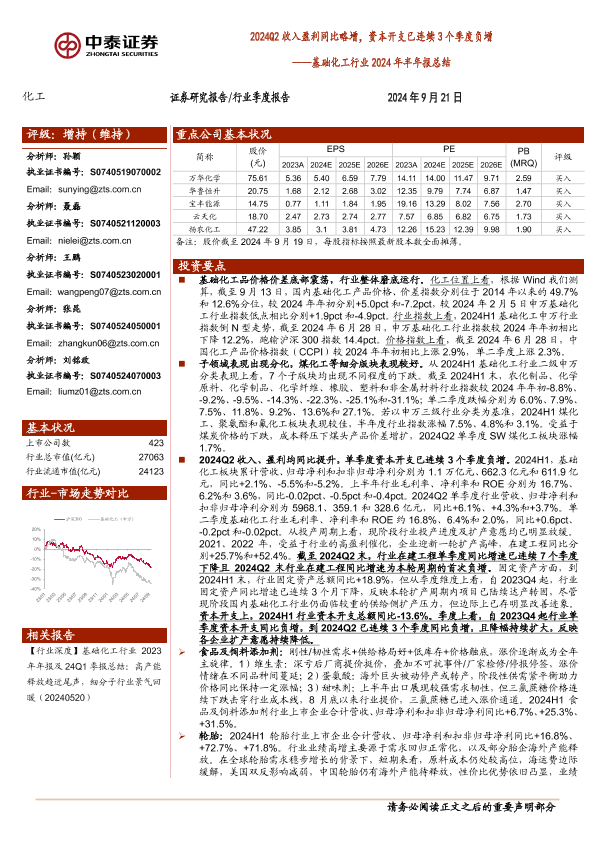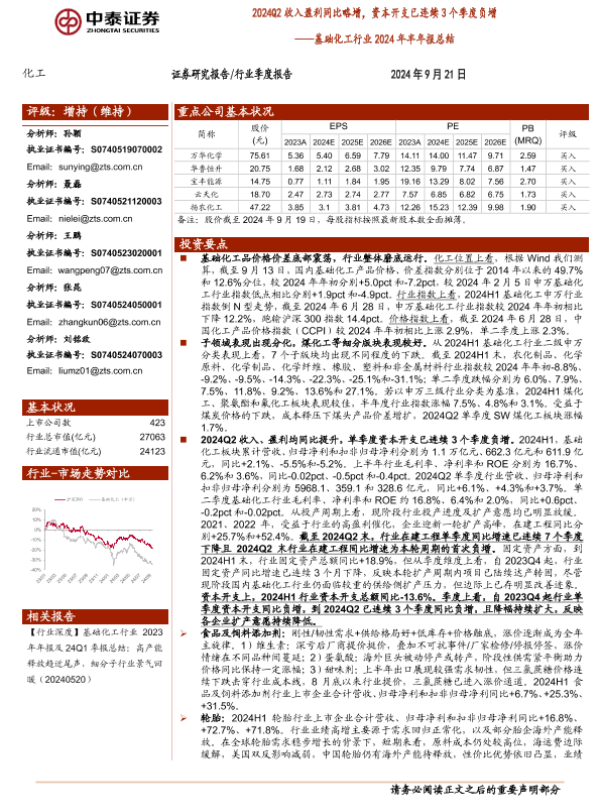 【中泰证券】【20240921】基础化工行业2024年半年报总结:2024Q2收入盈利同比略增,资本开支已连续3个季度负增-51页