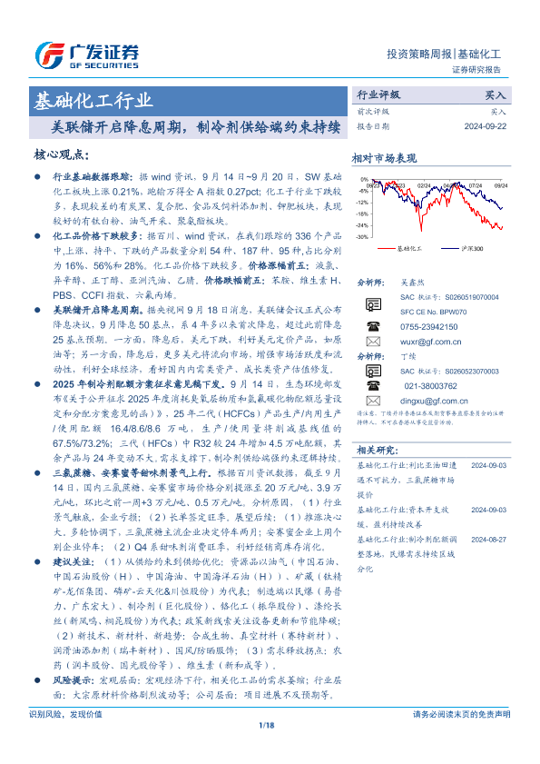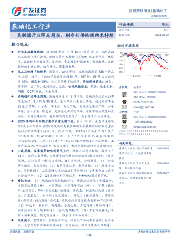 【广发证券】【20240922】基础化工行业:美联储开启降息周期,制冷剂供给端约束持续-18页