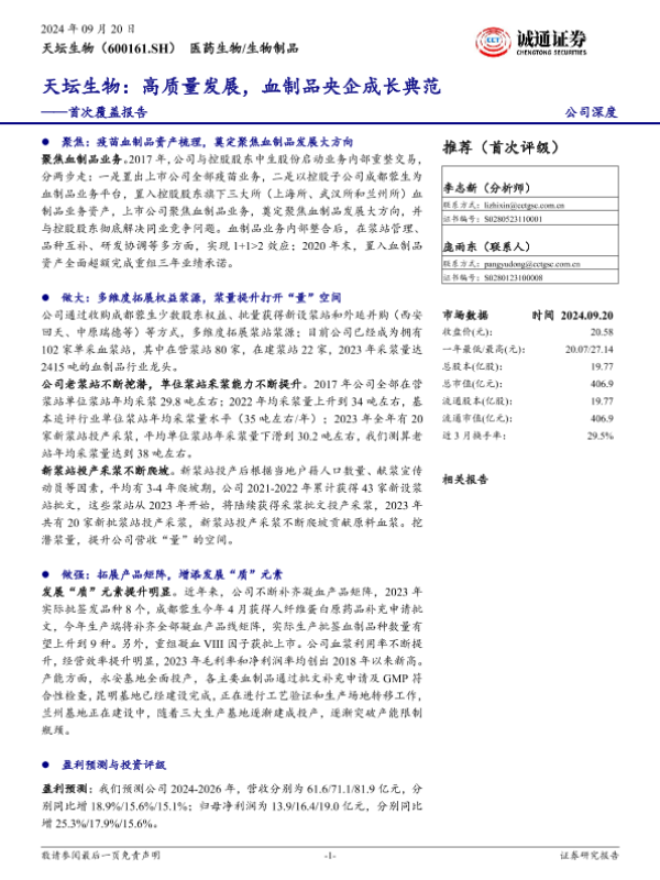 【诚通证券】【20240920】天坛生物(600161)首次覆盖报告:高质量发展,血制品央企成长典范-25页