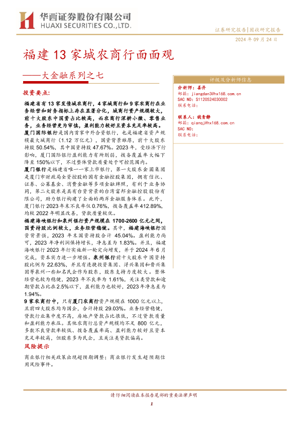 【华西证券】【20240924】大金融系列之七:福建13家城农商行面面观-18页