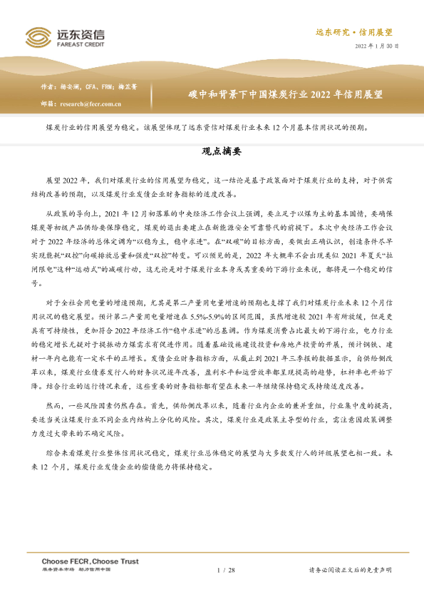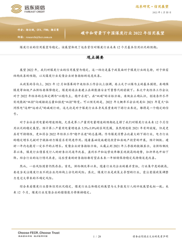 【远东资信】【20220130】碳中和背景下中国煤炭行业2022年信用展望-28页