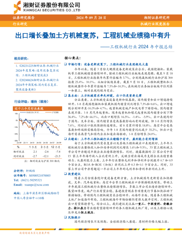 【湘财证券】【20240920】工程机械行业2024年中报总结:出口增长叠加土方机械复苏,工程机械业绩稳中有升-26页