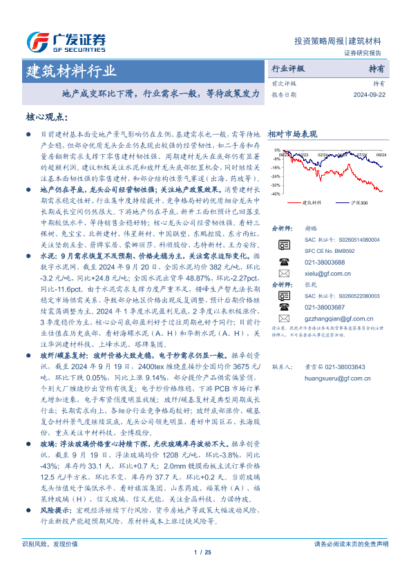 【广发证券】【20240922】建筑材料行业:地产成交环比下滑,行业需求一般,等待政策发力-23页