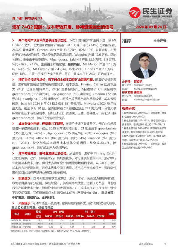 【民生证券】【20240924】澳矿24Q2跟踪:成本考验开启,静待资源端出清信号-23页