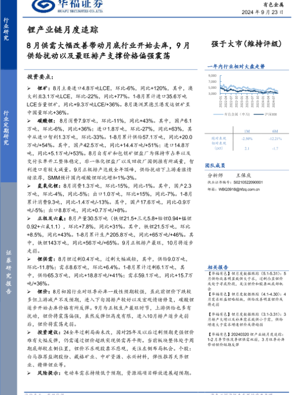 【华福证券】【20240923】有色金属行业锂产业链月度追踪:8月供需大幅改善带动月底行业开始去库,9月供给扰动以及最旺排产支撑价格偏强震荡-19页