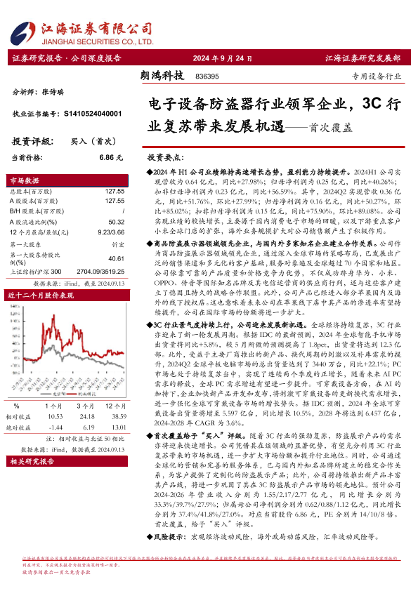 【江海证券】【20240924】朗鸿科技(836395)首次覆盖:电子设备防盗器行业领军企业,3C行业复苏带来发展机遇-19页