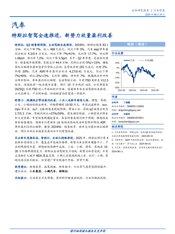 【国盛证券】【20240924】汽车行业深度:特斯拉智驾全速推进,新势力放量盈利改善-12页