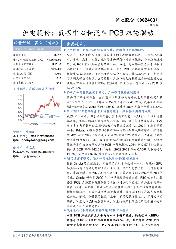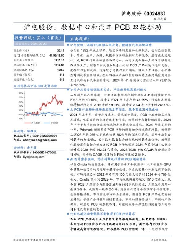 【华安证券】【20240923】沪电股份(002463)数据中心和汽车PCB双轮驱动-27页