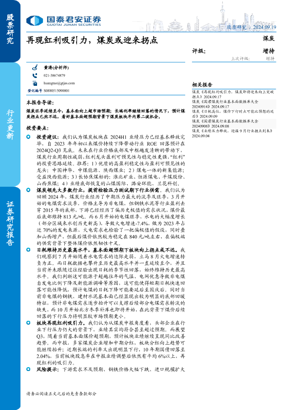 【国泰君安证券】【20240919】煤炭行业:再现红利吸引力,煤炭或迎来拐点-13页