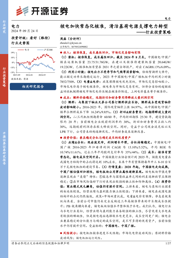 【开源证券】【20240924】电力行业投资策略:核电加快常态化核准,清洁基荷电源支撑电力转型-37页