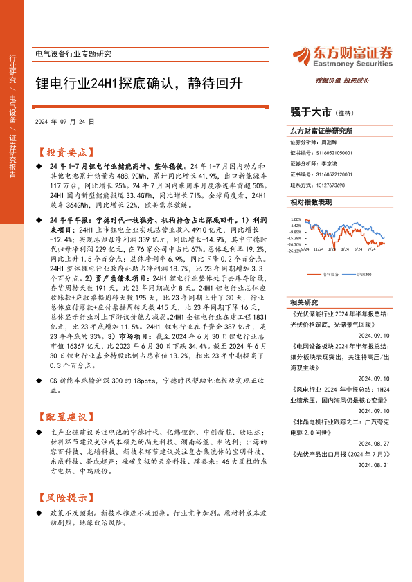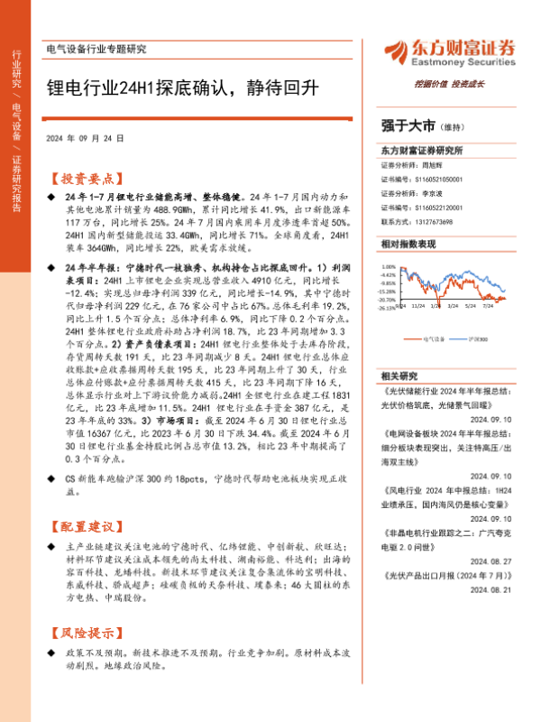 【东方财富证券】【20240924】电气设备行业专题研究:锂电行业24H1探底确认,静待回升-23页