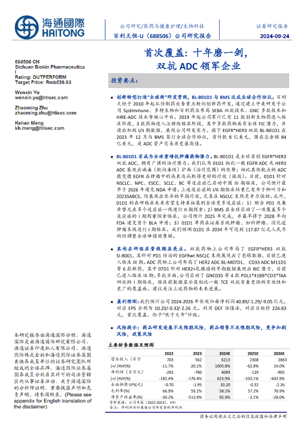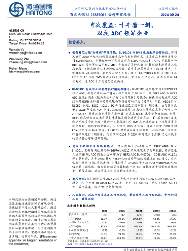 【海通国际】【202409】百利天恒(688506)首次覆盖:十年磨一剑,双抗ADC领军企业-35页