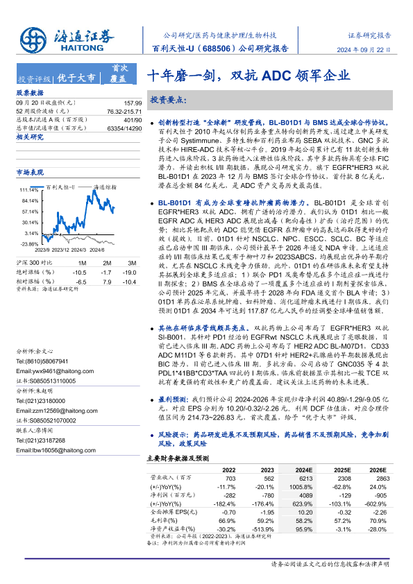 【海通证券】【20240922】百利天恒-U(688506)公司研究报告:十年磨一剑,双抗ADC领军企业-26页