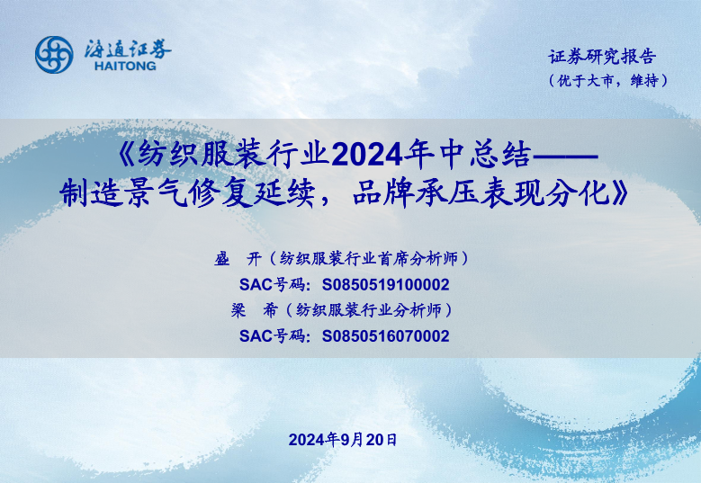 【海通证券】【20240920】纺织服装行业2024年中总结:制造景气修复延续,品牌承压表现分化-45页