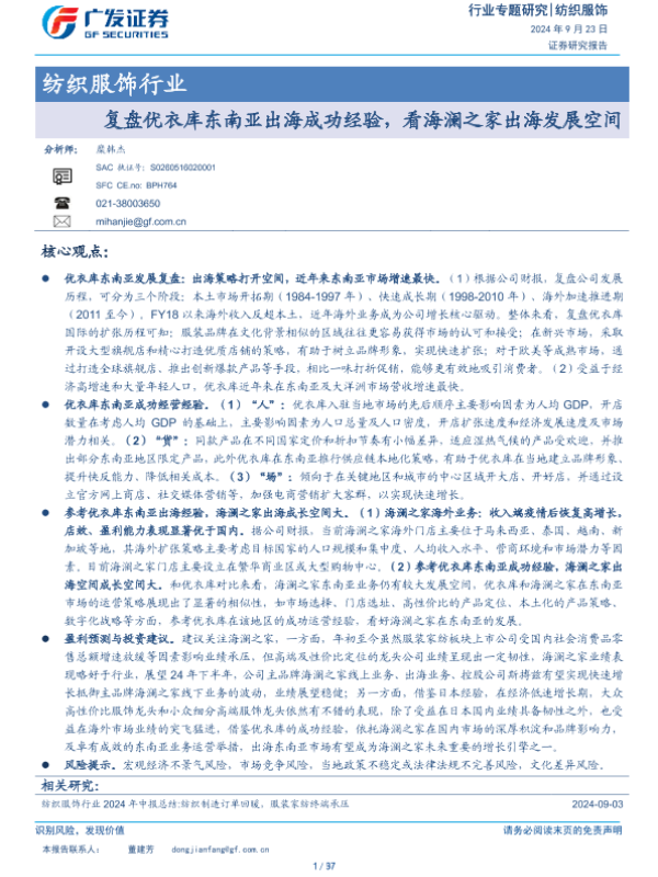 【广发证券】【20240923】纺织服饰行业:复盘优衣库东南亚出海成功经验,看海澜之家出海发展空间-37页