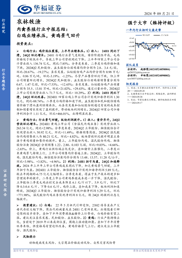 【华福证券】【20240921】肉禽养殖行业中报总结:白鸡业绩承压,黄鸡景气回升-13页