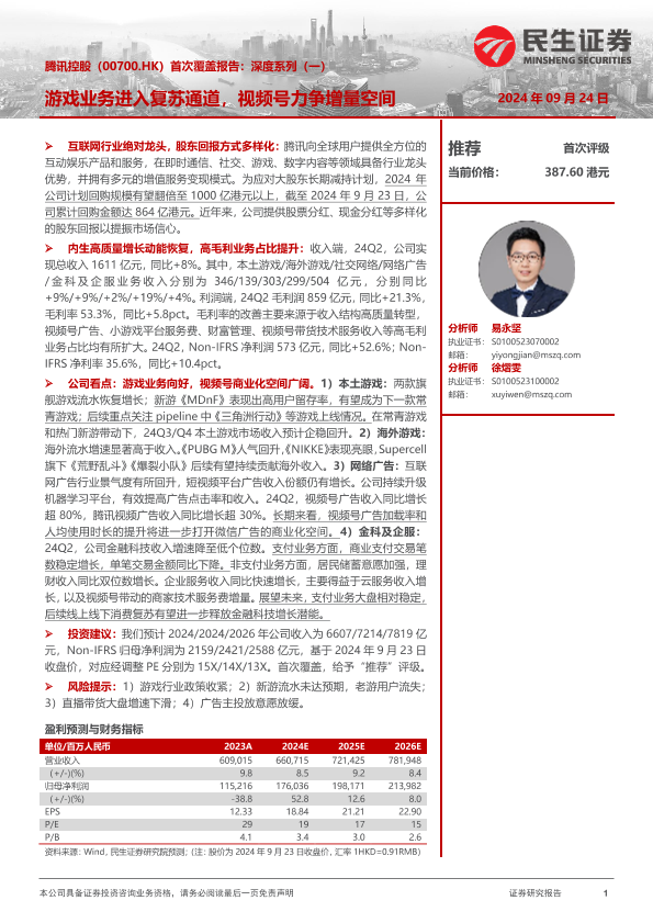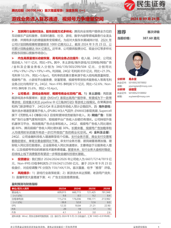 【民生证券】【20240924】腾讯控股(00700.HK)首次覆盖报告:深度系列(一),游戏业务进入复苏通道,视频号力争增量空间-38页